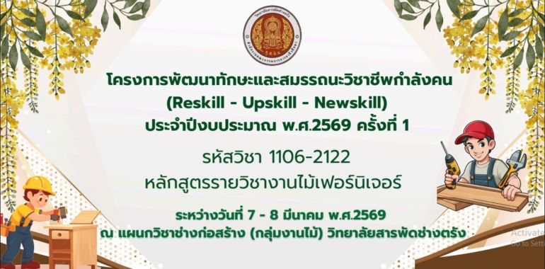โครงการ พัฒนาทักษะและสมรรถนะวิชาชีพกำลังคน (Reskill – Upskill – New skill) ประจำปีงบประมาณ พ.ศ. 2569 ครั้งที่ 1หลักสูตรงานไม้เฟอร์นิเจอร์