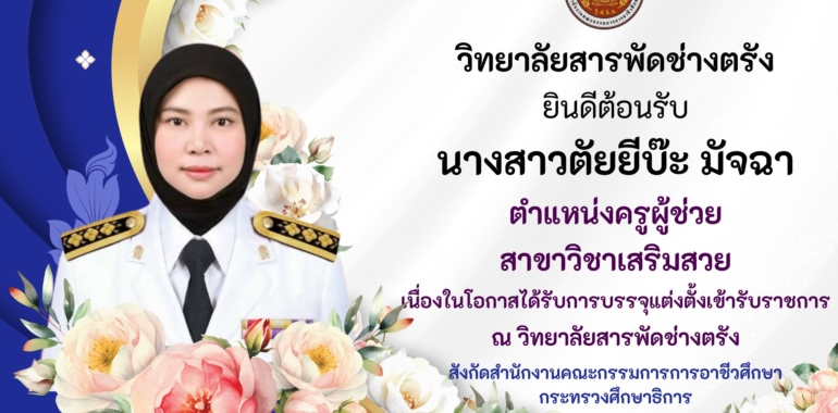 ต้อนรับนางสาวตัยยีบ๊ะ มัจฉา เนื่องในโอกาสได้รับการบรรจุแต่งตั้งเข้ารับราชการ ตำแหน่งครูผู้ช่วย สาขาวิชาเสริมสวย ณ วิทยาลัยสารพัดช่างตรัง by adminpttPosted on 05/03/202605/03/2026Posted in ข่าวกิจกรรม